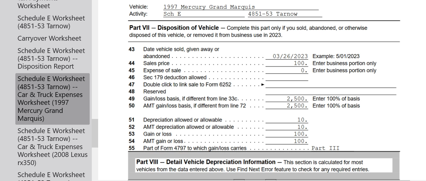 I ran into many errors with Turbo Tax Federal REVIEW, so I am not sure I've accounted for the vehicle sale correctly? I need some assurance that I've completed this correctly.
