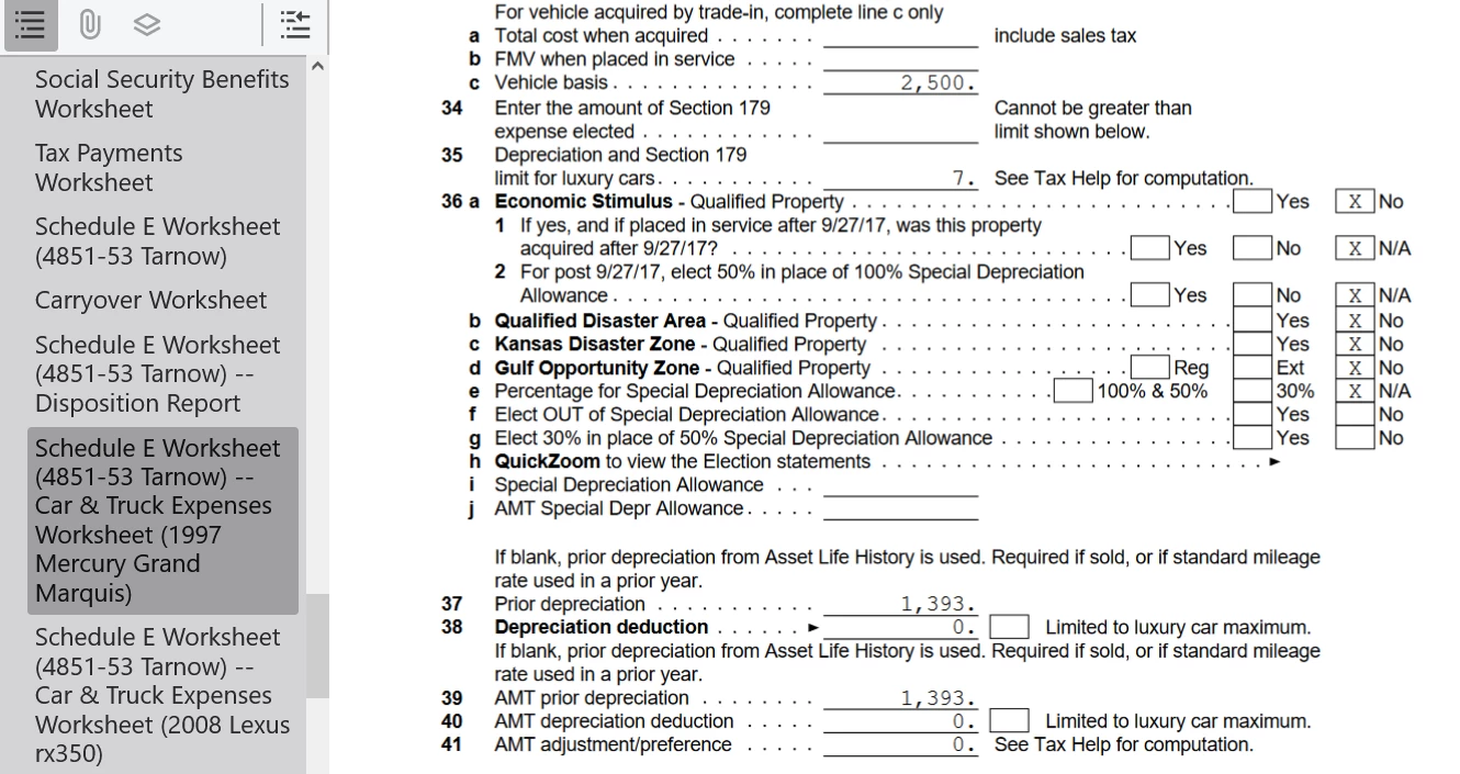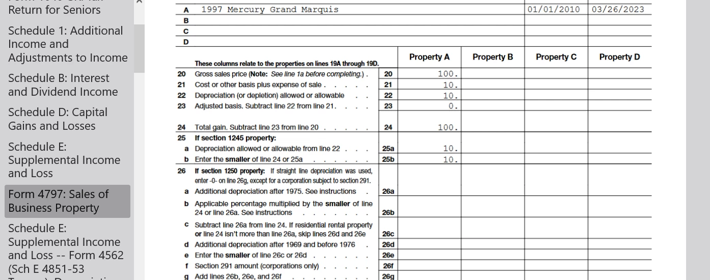 I sold a vehicle I partially used for my rental property for $400. I used the car 25% for the rental, so I entered $100 ($400 x 0.25) as the SALES PRICE. (I hope that is correct)? I purchased vehicle for $2500 in 2010. I figure it is fully depreciated, since I have been taking the standard mileage deductions every year. (I found the table that lists the depreciation per mile amount, of the standard mileage deduction, and am fairly sure I claimed all $2500 of the original purchase price with my 13 years of standard mileage deductions which include the depreciation allowance).