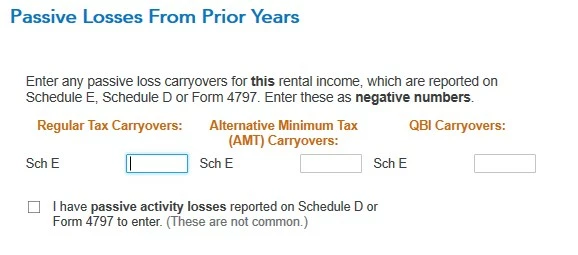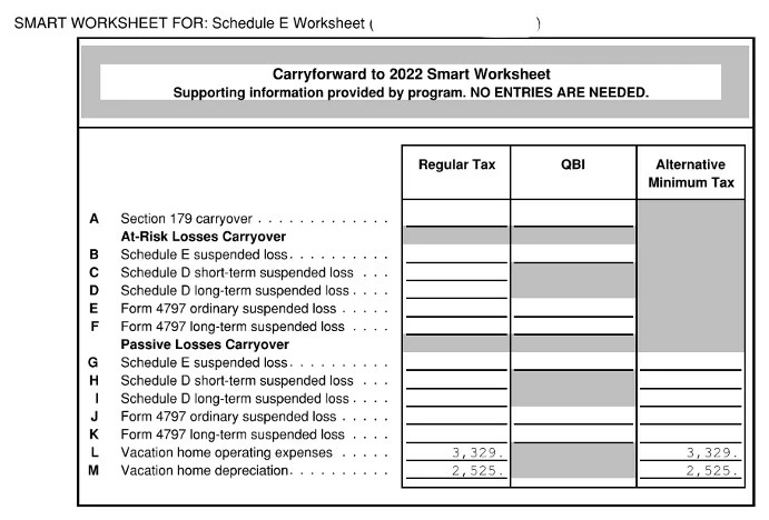 3) I'm using desktop version of TT H&B. On the "Do any of These Situations Apply to This Property?" page, I tick the box for "I have passive activity real estate losses carried over from a prior year". Then on the next page I enter Sch E regular tax Carryover and AMT Carryover amounts, which I pulled from the 2021 Sch E worksheets mentioned before (and entered as negative numbers). When I did that, my 2022 forms looked like the carryover amounts were credited in two places. I wish I could post a picture, but I'll try and explain. On this 2021 Schedule E worksheet (Carryforward to 2022 Smart Worksheet) I have numbers on Line L (Vacation Home operating expenses) and Line M (Vacation Home Depreciation), but I DO NOT have anything on Line G (Schedule E suspended loss). So, when it asks me for my 2022 taxes if I have any "passive loss carryovers for this rental income which are reported on Schedule E", is the answer YES (because I have numbers on Line L and M), or NO (because line G is blank)?