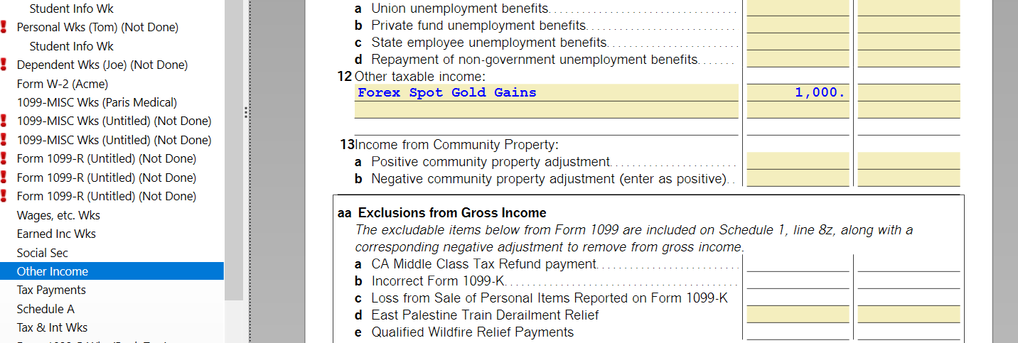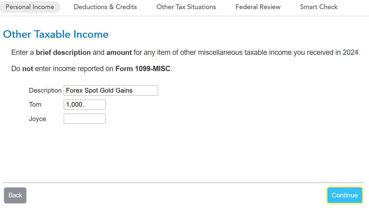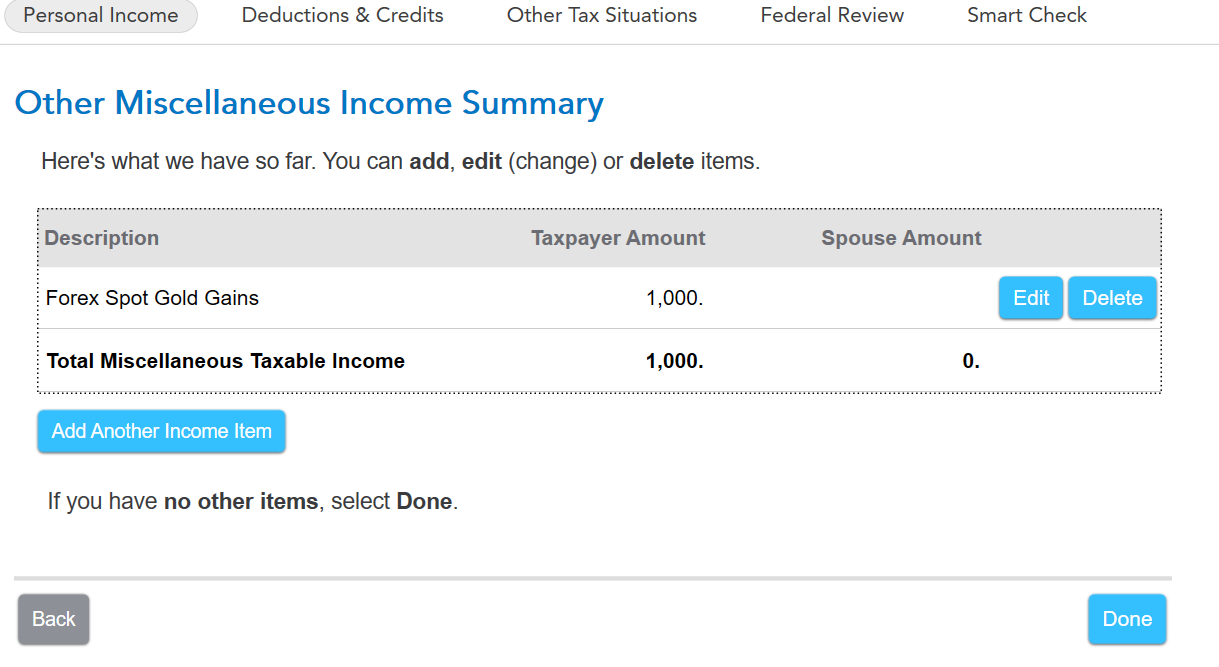 How to enter profits from FOREX spot gold trading on International Gold Markets into Turbotax Desktop 2024