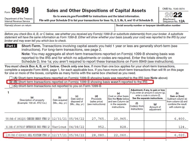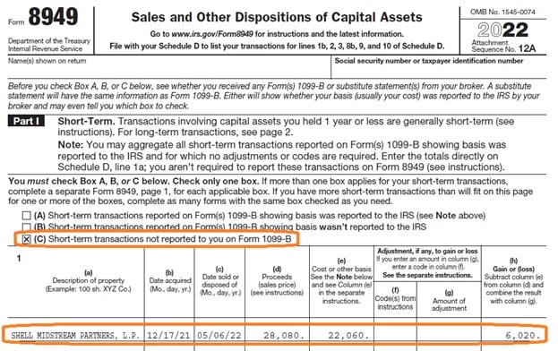 A second form 8949 has box C checked for short term transactions not reported to you on Form 1099-B. This form includes a sale of 2,000 shares of Shell Midstream Partners LP. The data acquired is shown as 12/17/21 and the date sold is shown as 5/6/22. The proceeds are shown as 28,080 and the cost is shown as 22,060. The gain is shown as 6,020.