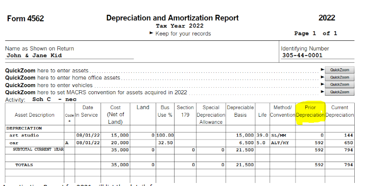 As you can see in the screen shot, prior depreciation is for 2021 and before while current depreciation is for 2022. Those must be added together to get the correct number for 2023 prior depreciation.