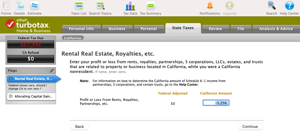 I am a TX resident with CA rental property generating loss for 2021. I filed my tax using turbotax desktop version for 2021. I added CA state as non resident and my inputs from federal return passed over to CA state return. The CA(540NR) Part II section B line 5 Column E is ZERO. That column title is "CA Amounts (income earned or received as a CA resident and income earned or received from CA sources as a nonresident)".