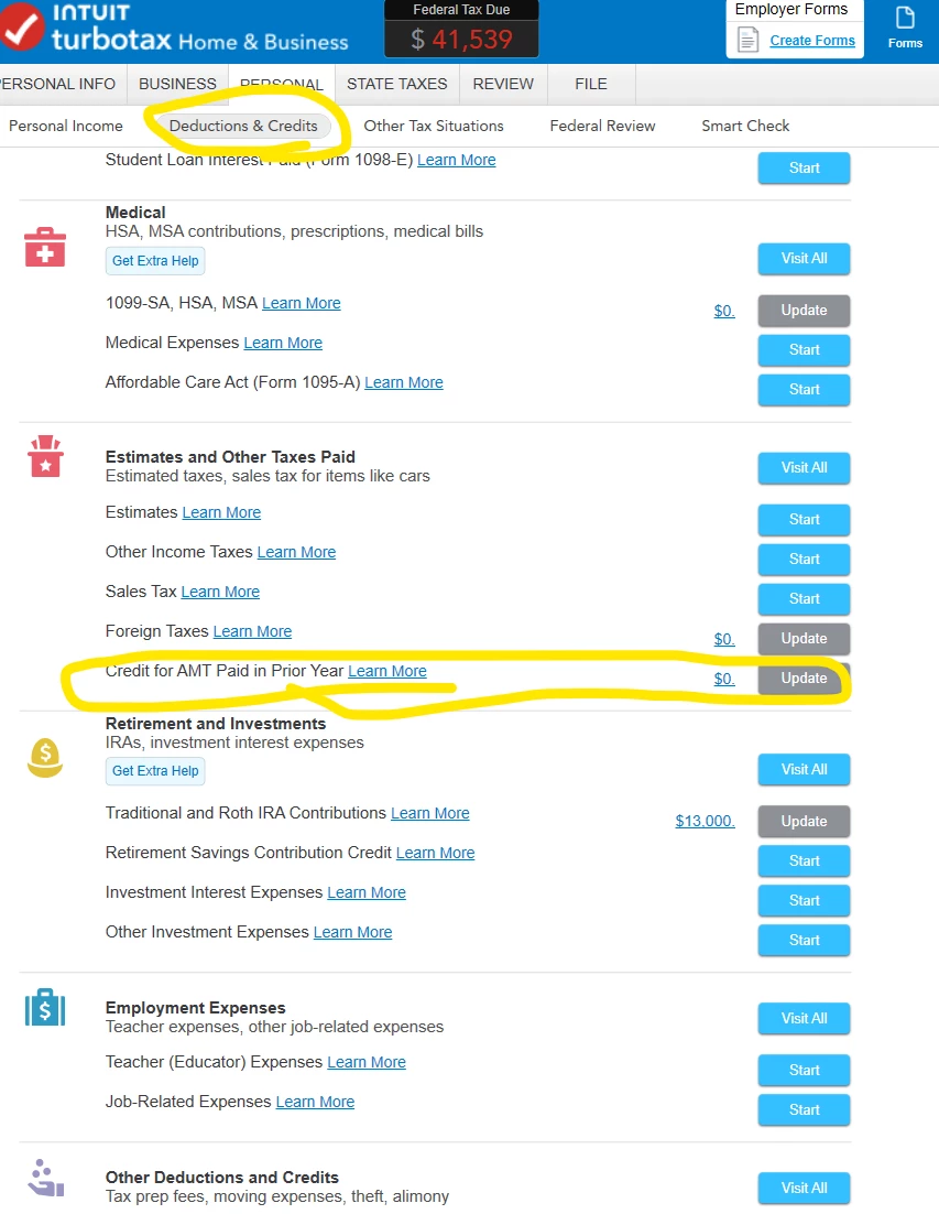 However, in my test file I am seeing the AMT capital loss limited to $3k per year. And I have not figured out how to get the AMT credit form 8801 to work. That will be critical to getting you any credit. Sorry to say you might not actually get any credit if your AMT loss is limited to $3k and your AMT is not a lot less than your regular tax. But I have not figured out the 8801, so I just don't now.