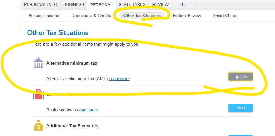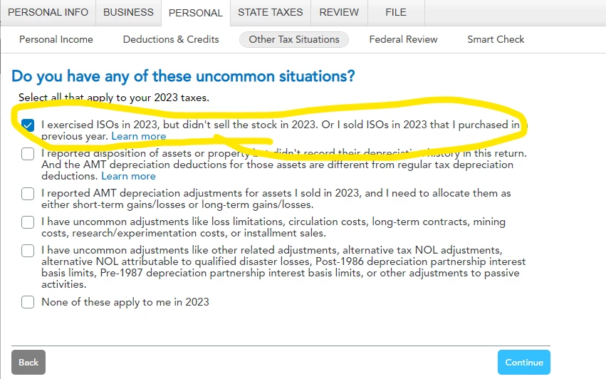That worksheet then lets you check Part II, line 10b (stock option) and in Part IV you enter the grant/exercise/sale info. It will then flow the different AMT gain to the Schedule D AMT and the 6251.