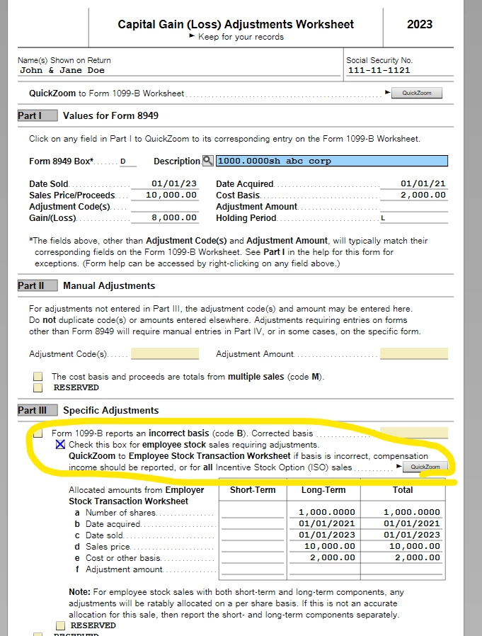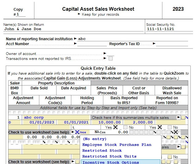 Double clicking (on PC don't know about Mac) on any of the fields there (or selecting the field and clicking the magnifying glass) got me to the Capital Gain (Loss) Adjustments Worksheet. Part II has a checkbox and link to the Employee Stock option Worksheet.