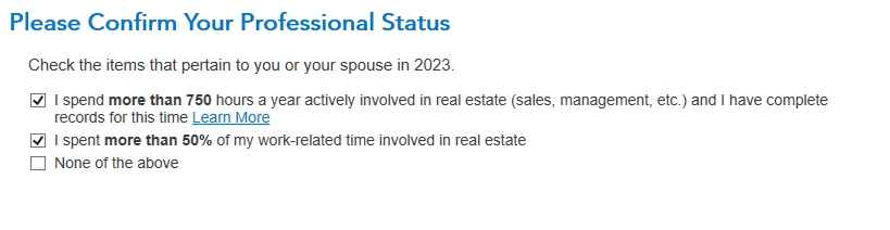 I have been reading about the reason rental losses are not allowed and from what I have read it appears that losses should not be counted as passive if you are considered a real estate professional. When I answer the above questions on TurboTax the rental is still counted as passive. This is for tax year 2023.