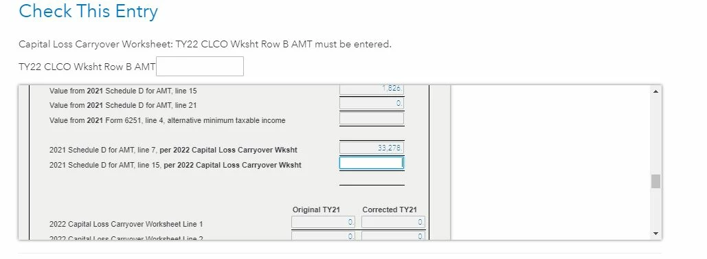 - Capital Loss Carryover Worksheet: TY2022 CLCO Wksht Row B AMT must be entered