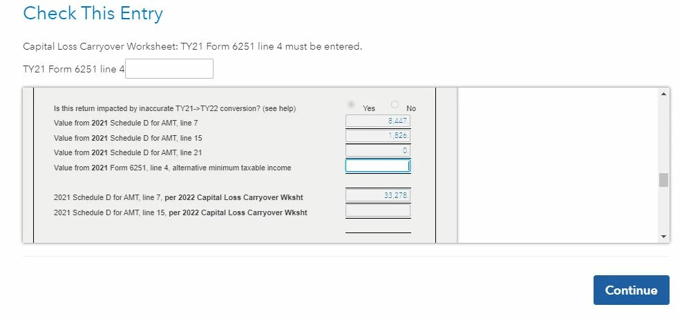 - Capital Loss Carryover Worksheet: TY2021 Form 6251 line 4 must be entered