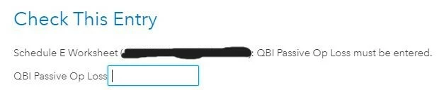 - Schedule E Worksheet (*Rental Property*): QBI Passive Op Loss must be entered