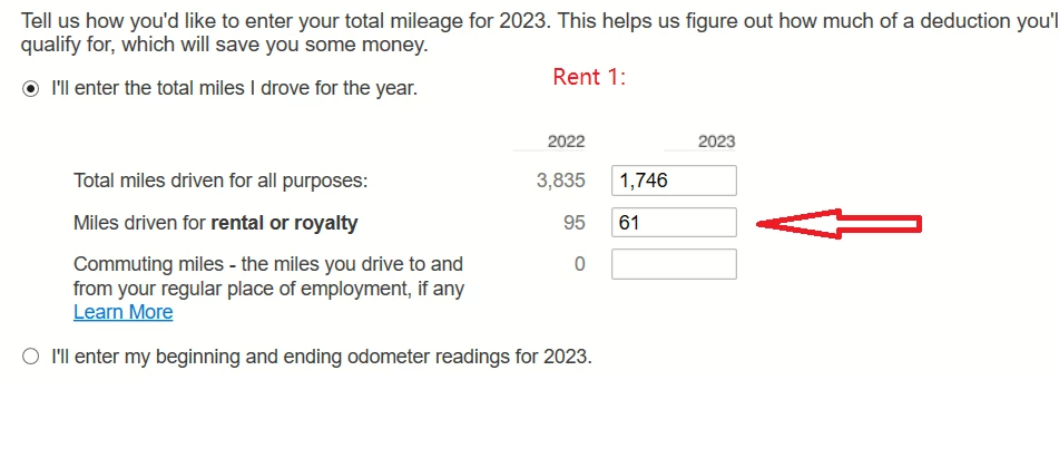 Thus Turbotax calculated 3.49% (61/1746) business use for rent 1, and 13.8% business use for rent 2, but this is wrong, right? Because 1,746 miles include two business uses ( 61 and 241).