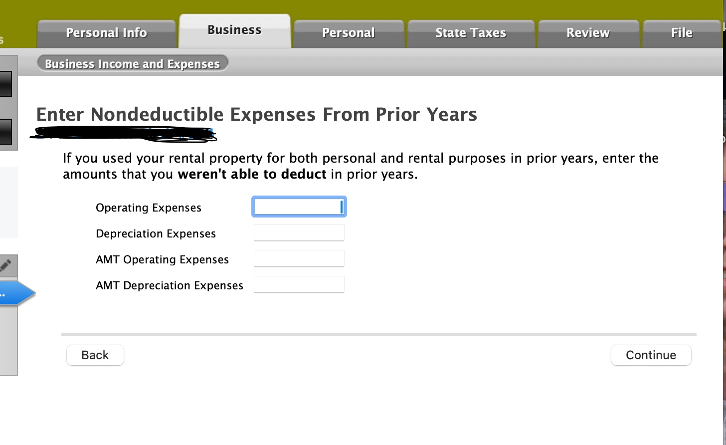 Rental Property: "Enter Nondeductible Expenses from Prior Year"