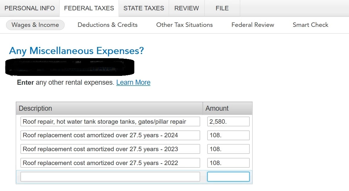 Q2. My rental condo's roof was replaced in 2021. Tax & Accounting Consultant had advised that roof replacement payment of $2967 would be amortized over 27.5 years instead of being expensed all in 2021. While doing 2024 taxes, I realized that I had missed including this expense in 2022 and 2023. Can I include these along with my 2024 expense (separate line by year) under Any Miscellaneous Expenses ? see enclosed attachment