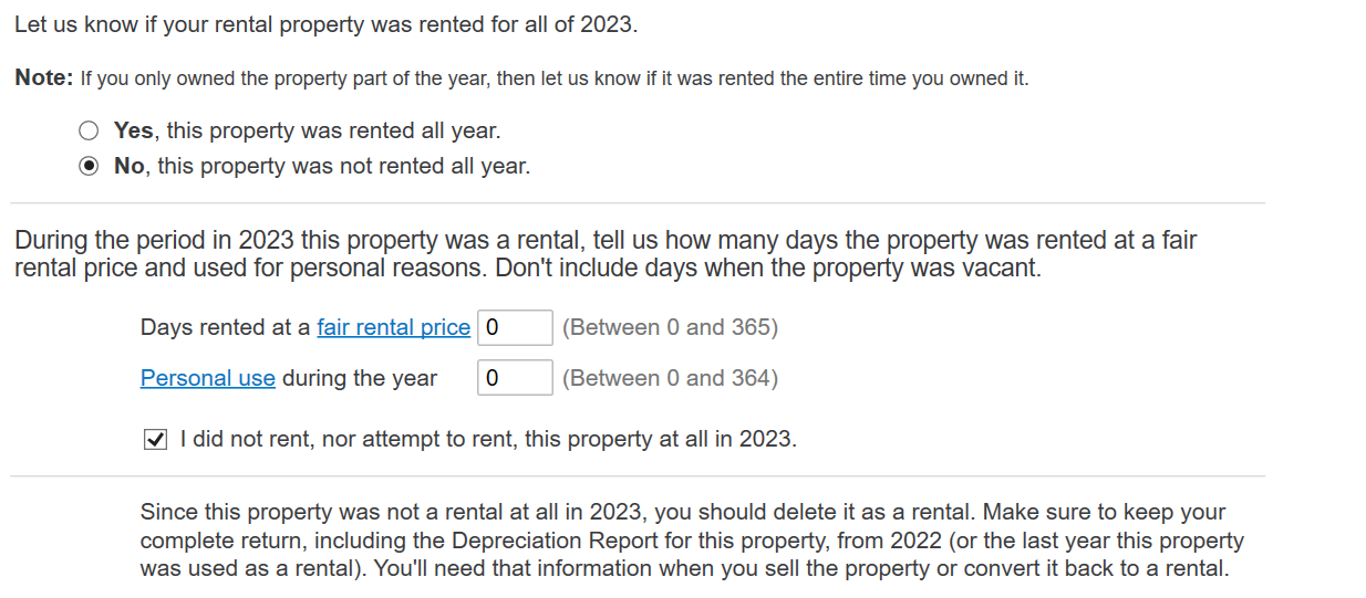 I have TT home and business: having trouble finding out where to enter the sale of my FL rental property for 2023? When I check sold on the "Do any of these situations apply to this property" it disappears from the income and expense section and there is no way to find it again. I have had to start another return and download last year again. I'm stuck? Any ideas?