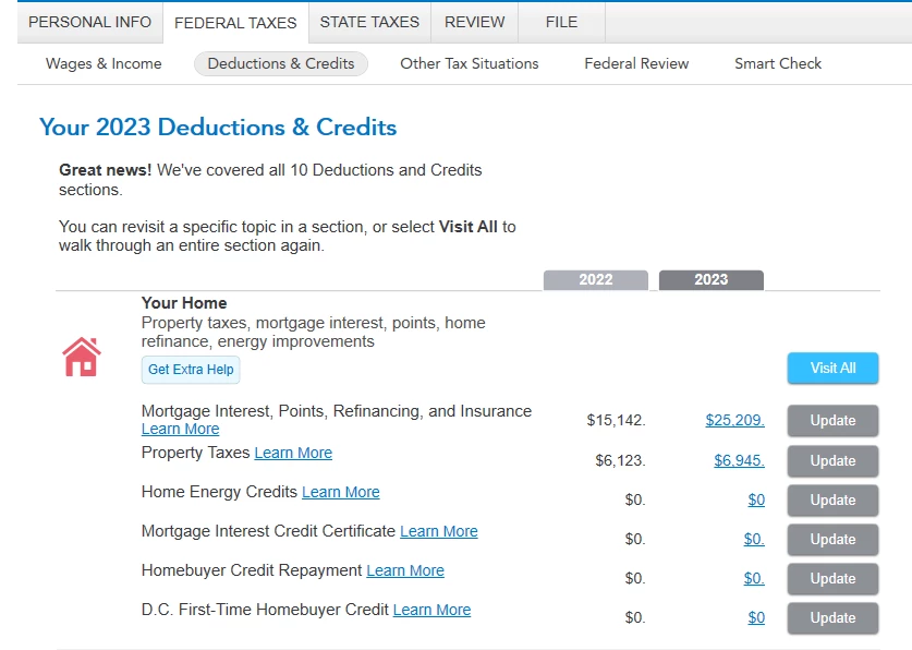 I then continue and complete the Deductions and Credits, Your Home section, Mortgage Interest, Points, Refinancing and Insurance sub section, I entered all of my 1098 information. Box 1 Mortgage Interest which was $14,896.