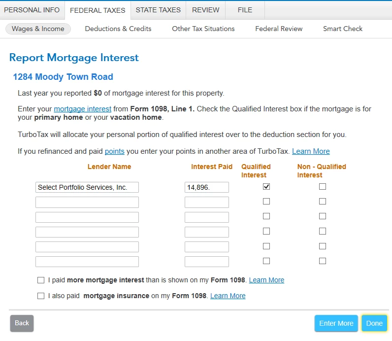 Going through the step-by-step process for Wages & Income, under the Rental Properties and Royalties section, Rental and Royalty Summary, Expenses, Report Mortgage Interest, it instructs you to "Enter your mortgage interest from form 1098, line 1." I enter $14,896. and proceed through all of the steps...