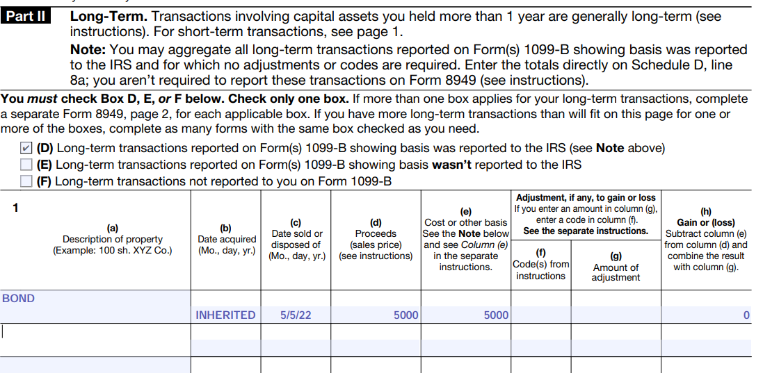 For example, you inherit a $5000 bond and sell it for $5000. When you report it on your taxes, the transaction looks like this:
