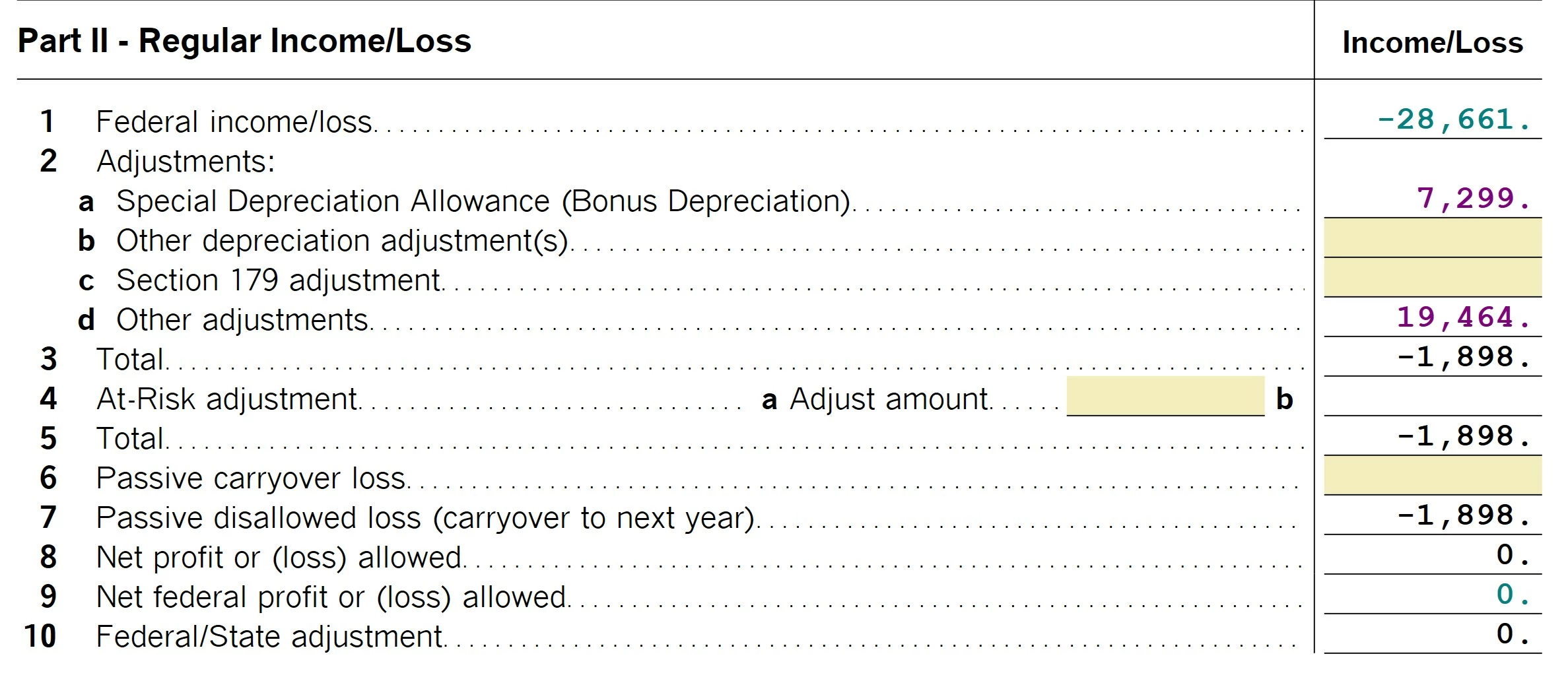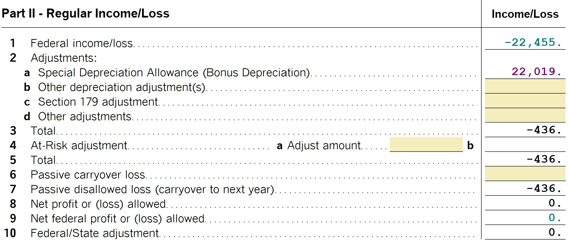 I tried playing with the depreciation adjustments (additions/subtractions) using the form below. But looks like it is adding it/subtracting it against my W2 federal income (Total Additions 8831+22314 = 31145; Total Subtraction1532+295=1827; Net adjustment = 29318). My understanding is that this should NOT be the case since I am just a limited partner. Passive loss cannot offset my W2 income and I don't materially participate.