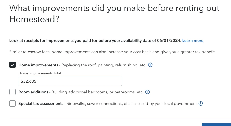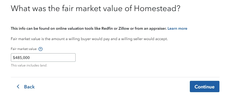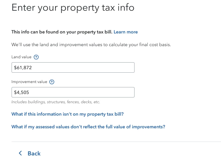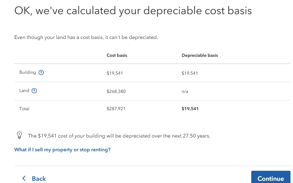 Good morning, I hope someone can help me with this. My previous residence was converted to a fulltime rental June 1, 2024. When I input the land value from the year I bought it in 2019 ($61,872) , the next page shows an incorrect calculation of land cost basis $268,380 and building cost basis of $19,541. Can you help guide me where these numbers come from?