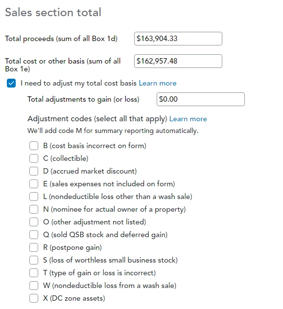I accumulated many shares of a company from April 2022 through December 17 2024. On Dec 20 2024 I sold the shares I accumulated from April 18 2022 through December 12 2023. Well, I screwed up because I didn't realize that the 4 shares I bought in November and December of 2024 would cause a wash sale. So the broker increased the cost basis of the first 4 stocks I bought in April 2022. Guess I had that coming. And the broker also increased the cost of the last 4 shares I bought before Dec 20 2024 (within 30 days prior to the sale) that were not sold. Is that okay? I wanted to see what TurboTax would do with this but I don't see how to enter the multiple lots I bought into TurboTax. I won't be entering the purchases after 12-12-2023 so TurboTax can't do anything there. Can someone tell me how to enter multiple lots?
