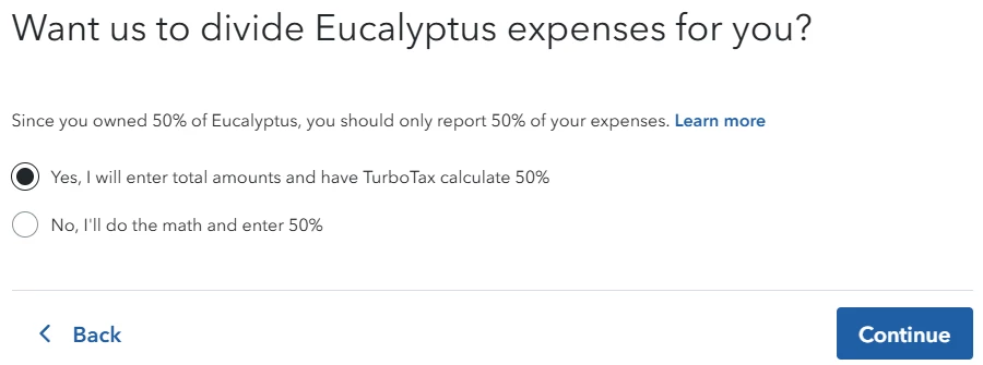 TurboTax gives the option of entering all of the expenses and then dividing them according to ownership for you, or "you do the math" and only enter the expenses you were responsible for. The same option does not appear for income, however, after I enter the percentage amount of income that I received, the Schedule E shows the amount has been divided again.