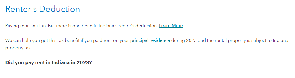 I live in Indiana and should receive a credit on my state return. However, Turbotax is not giving me the option of typing the rent amount on my return.