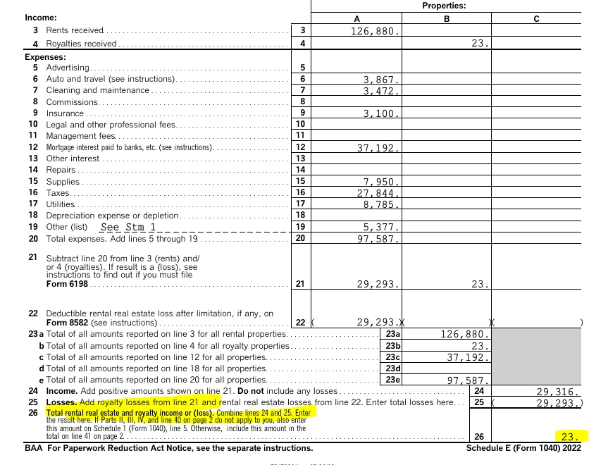 If the prior year has rental loss, which line on Sch E or on form 8582 shows the rental loss of the prior year?