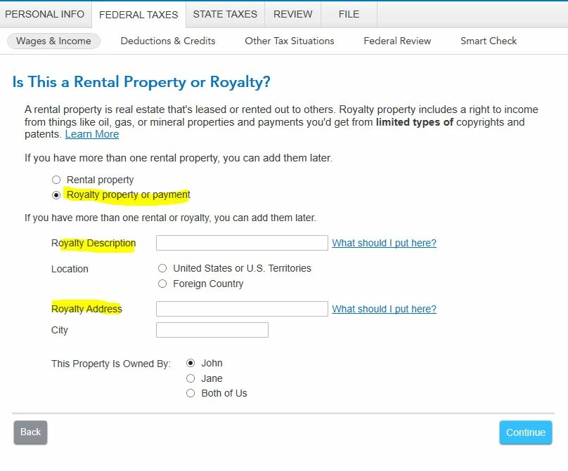 @lowrituh When you first start the Rental and Royalty section of the program one of the first screens asks you to select whether this is a rental or royalty property. Did you select Royalty?