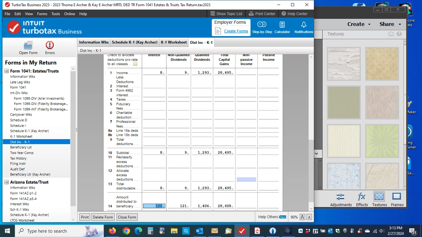 I am preparing a tax return for a trust with TurboTax Business. The Worksheet and also K-1 produced for this trust have erroneous figures. The numbers are correct where entered in the program and on Form 1041. How can I correct this? Do I need to delete the file and start over? As you can see from the screenshot below, line 14, and the information transferred to the K-1 is incorrect. The numbers above line 14 correspond to the information that I entered from the brokerage 1099. The trust earned $8 in interest last year, and surely the beneficiaries do not have to pay taxes on $120.