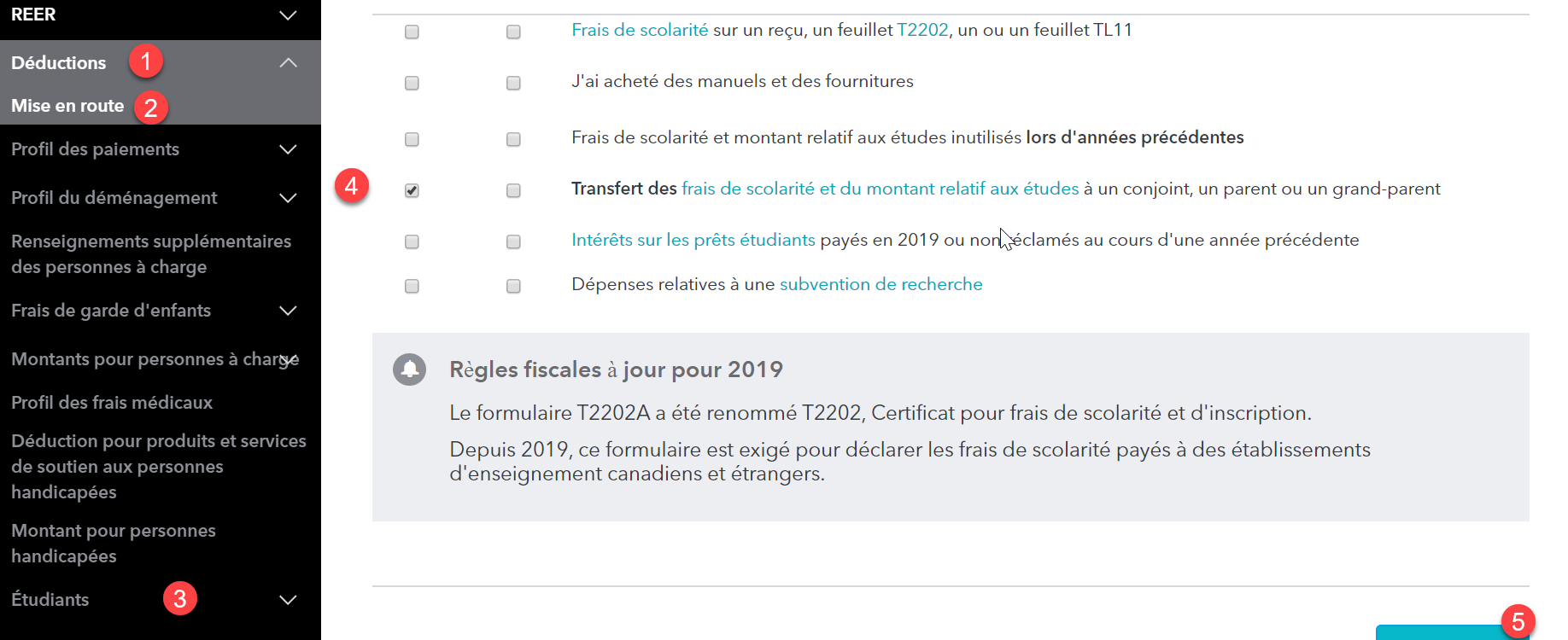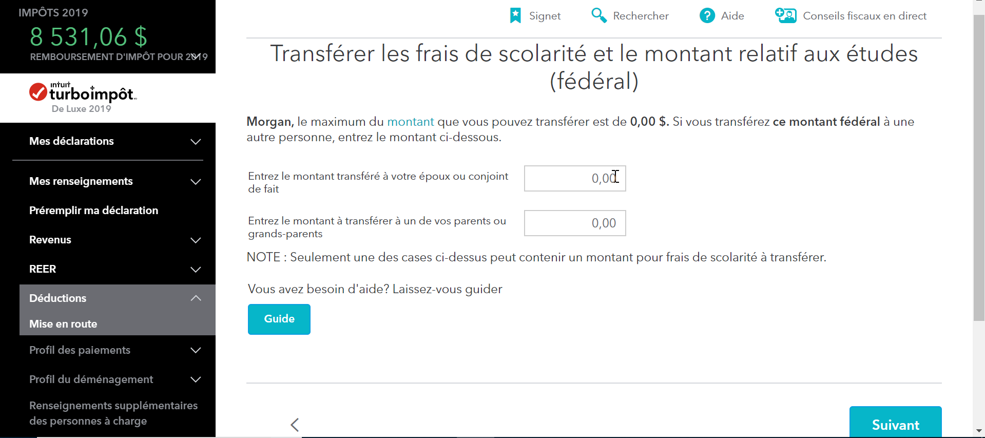 Vous êtes maintenant sur l'écran pour Transférer les frais de scolarité et le montant relatif aux études (fédéral)