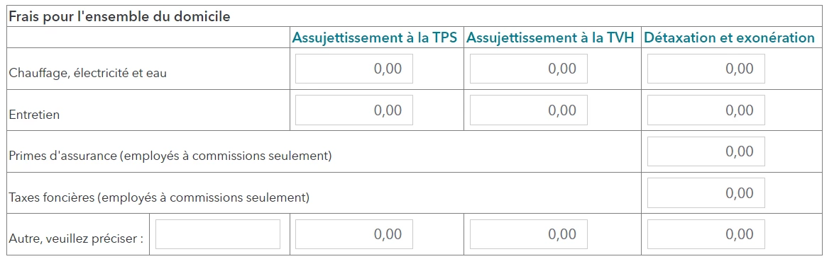 Si vous avez payé la TPS et la TVQ sur un frais quelconque, entrez le montant dans la colonne Assujetissement à la TVH.