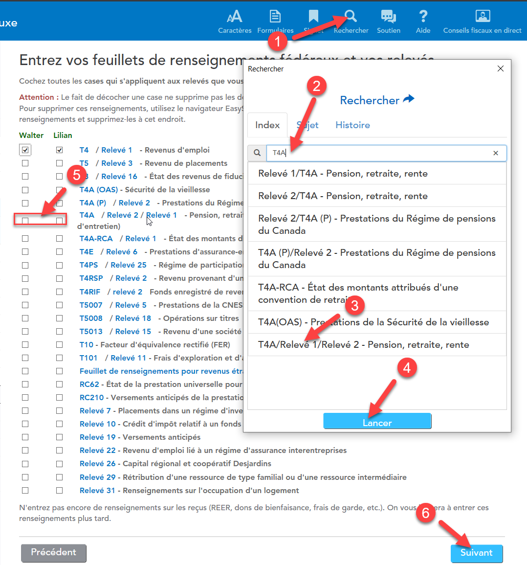 La façon la plus rapide d'entrer votre T4A dans TurboImpôt est d'utiliser l'outil Rechercher dans le coin supérieur droit de votre déclaration. Vous devez taper T4A, sélectionner l'option qui correspond le mieux à l'endroit où vous voulez aller et cliquez Allez-y/Lancer. Vous devez cocher tous les feuillets de renseignements qui s'appliquent à vous et cliquer Suivant pour entrer les informations dans chacun des feuillets.