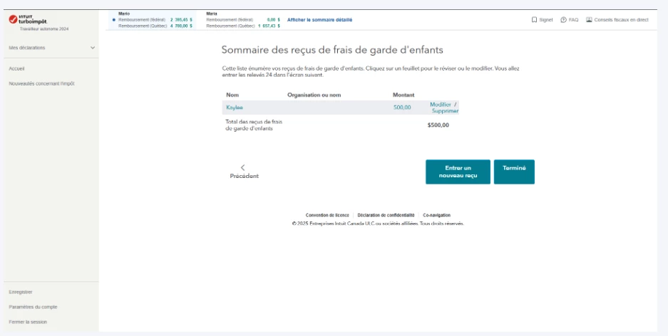 L'annexe C concerne les frais de garde, À la page d'accueil, dans la barre de recherche, taper Frais de garde. Répondre aux questions jusqu'à ce que vous arriviez au sommaire des reçus de frais de garde d'enfants. Vérifiez si vous avez un reçu en double.
