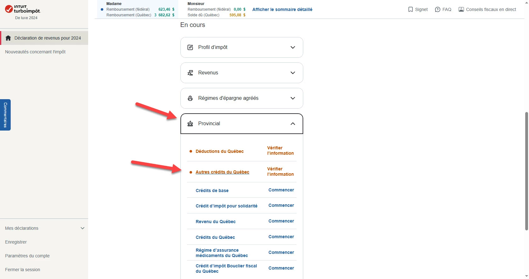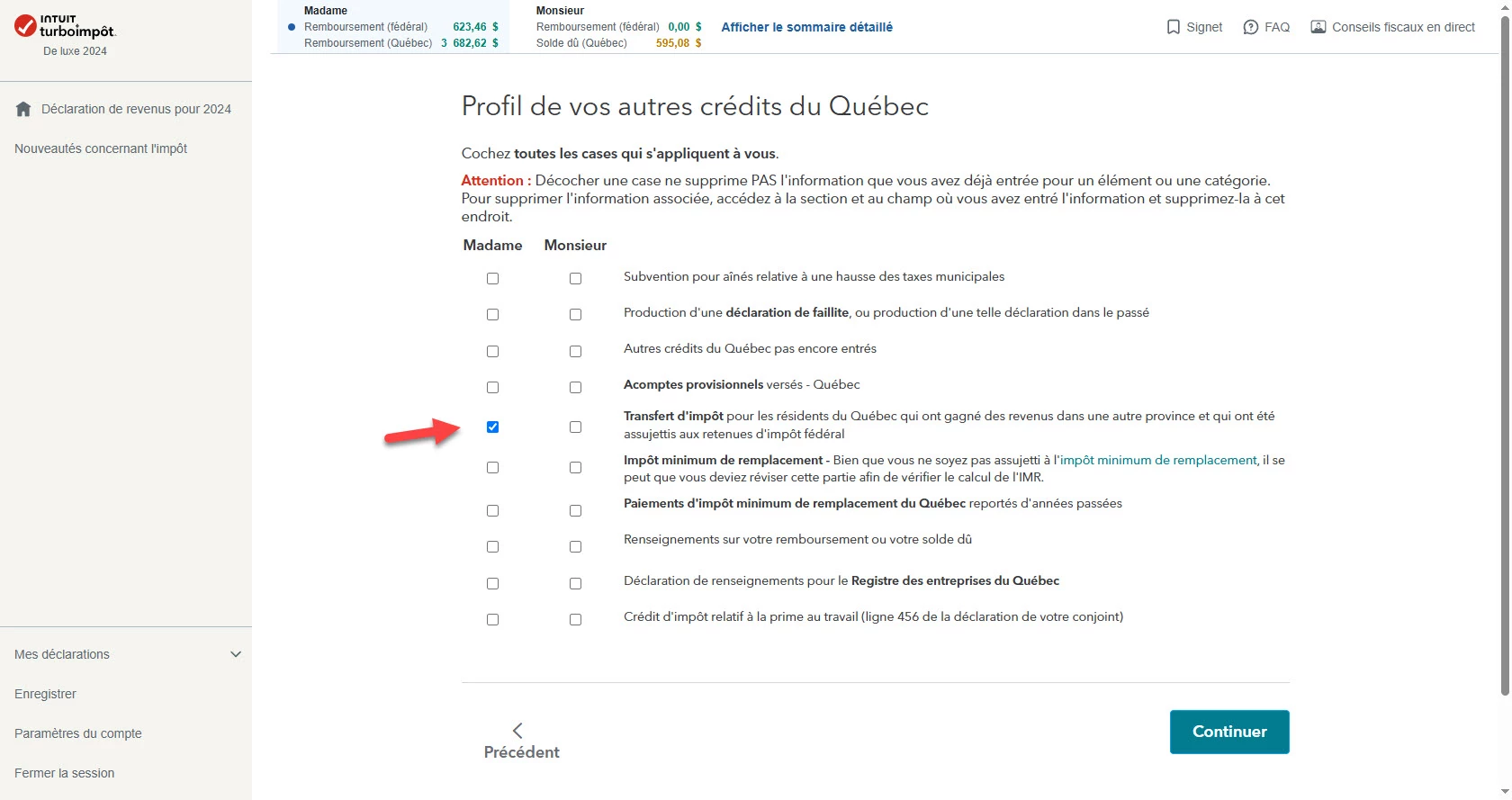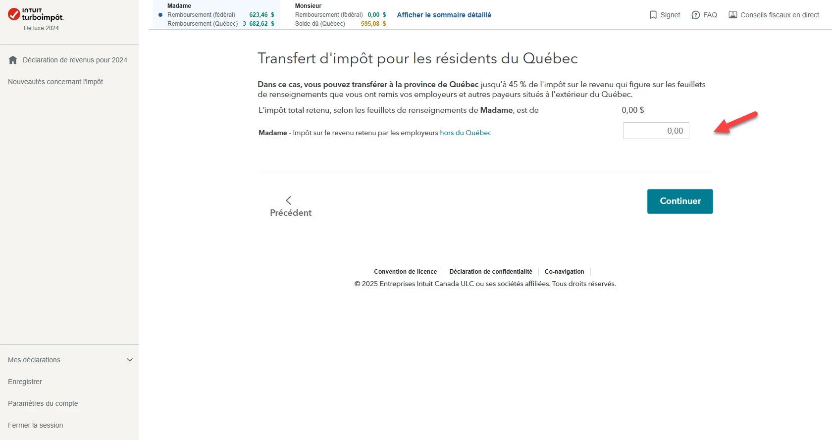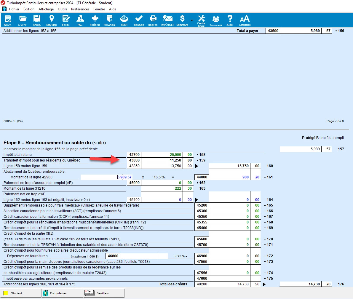 J'ai gagné un revenu en Ontario et j'aimerais transférer 45 % de l'impôt fédéral vers le Québec à la ligne 43800 et < la ligne 454 de la décration provinciale.