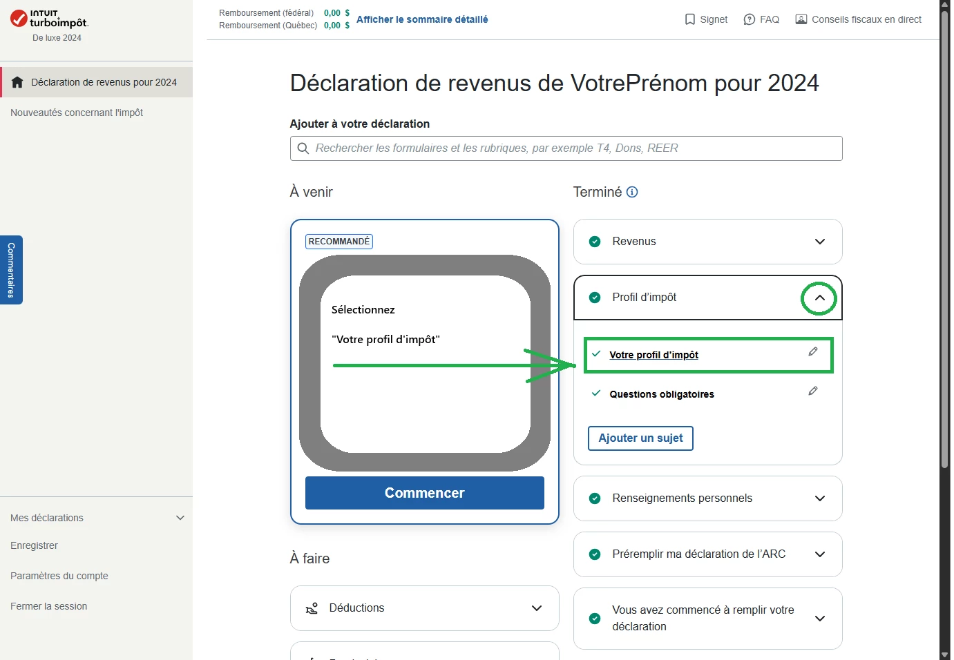 Je vous invite compléter votre Profil d'impôt. Au cours des pages qui seront présentées, vous pourrez informer TurboImpôt de votre situation et ensuite suivre le cours de l'entrevue lorsque vous arriverez à cette section.