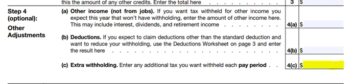 For example: If you owed $2,000 more in taxes and have 10 more “pay periods” this year, that’s $2,000/10 = $200 that would go on line 4(c).
