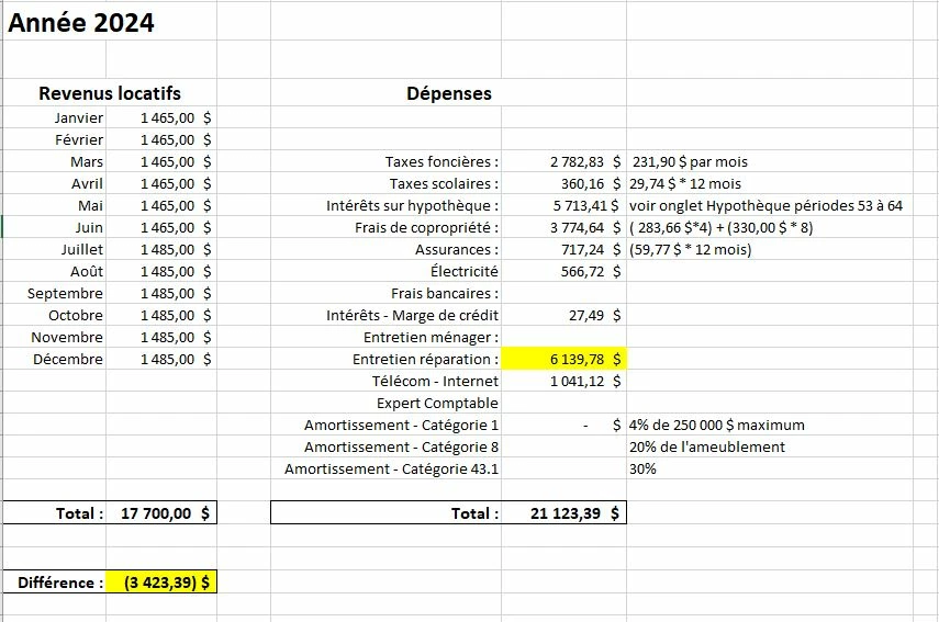 Si c'est une dépense, dois-je la mettre comme dépense au complet ce qui occasionne une différence de 3 423 $ et ainsi occasionner une perte que je peux utiliser pour amortir mes impôts personnels.