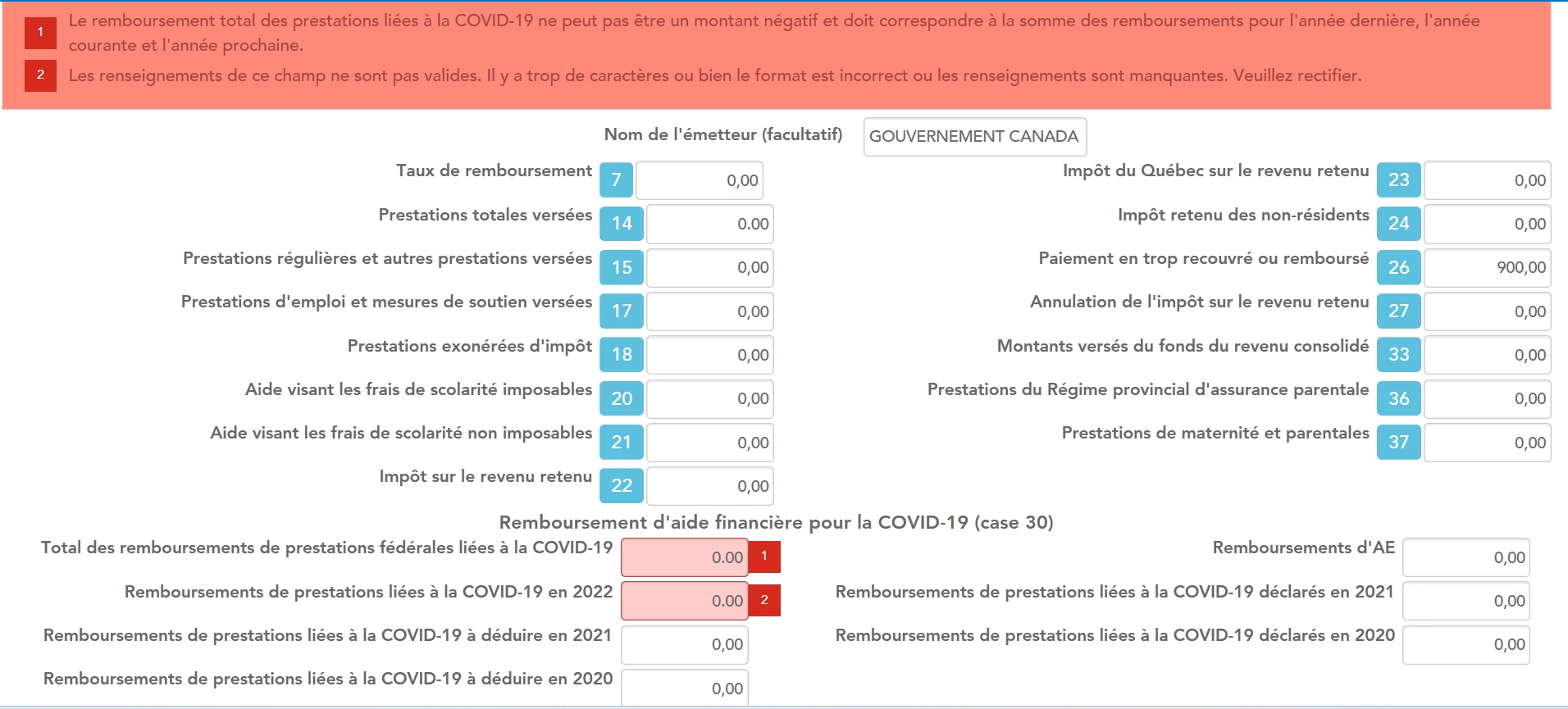 Sur mon T4E il y a un montant de 900$ inscrit à la case 26 et 30. Par contre, pour la case 30 j'ai plusieurs choix dans Turboimpôt et lorsque j'inscrit le montant dans une des cases dans la section ''Remboursement d'aide financière pour la COVID-19 case 30'' il y a le message suivant qui apparraît :