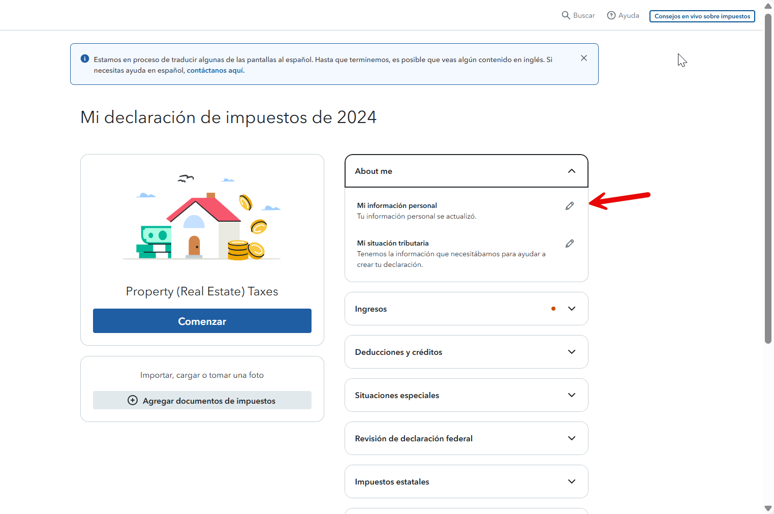 Para cambiar su estado civil tributario en la declaracion lo puede hacer desde la primera seccion "About Me". Vea las imagenes siguientes como referencia