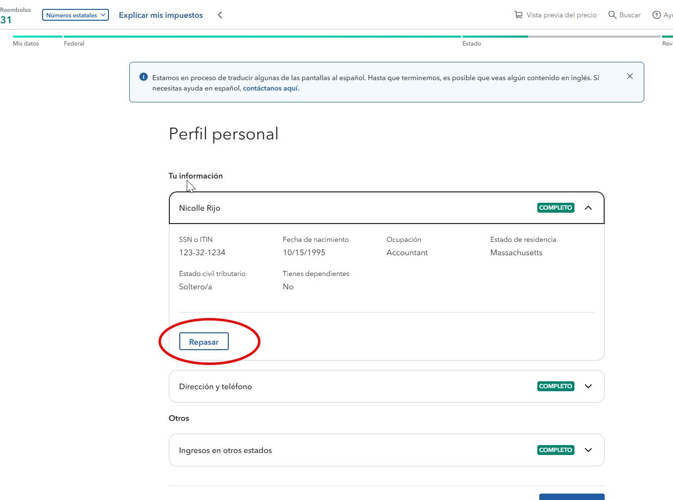 Luego desde la pagina de su perfil personal haga click en "repasar" debajo de "Tu informacion"