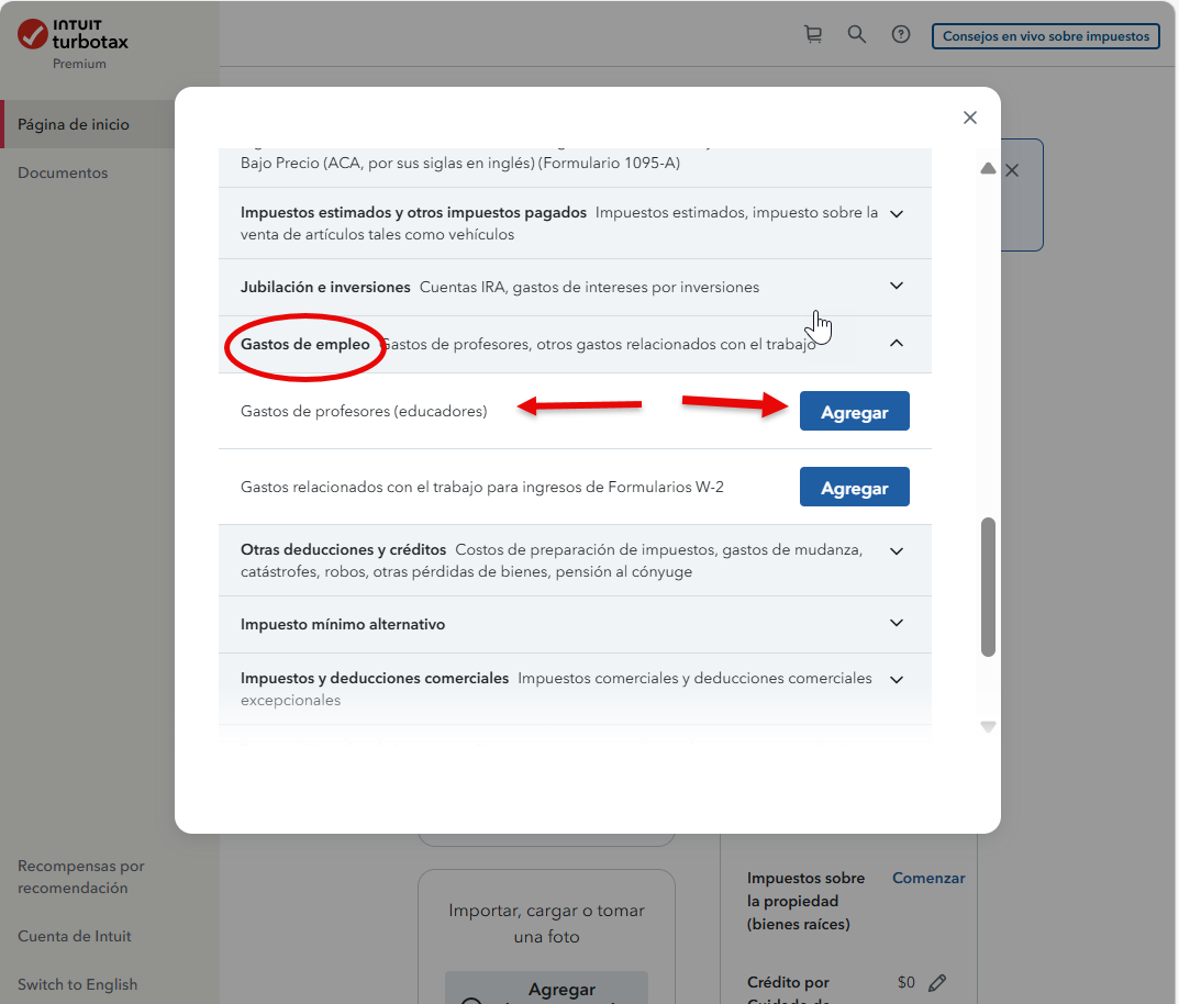 Se abrira un menu, localize Gastos de Empleo, y subsecuente Gastos de Profesores. Haga click en Agregar. Esta seccion sera anadida a su pagina de inicio. Luego de que sea agregada, cierre el menu, y vuelva a la seccion inicial de Deducciones y Creditos y ahi estara la seccion deseada.