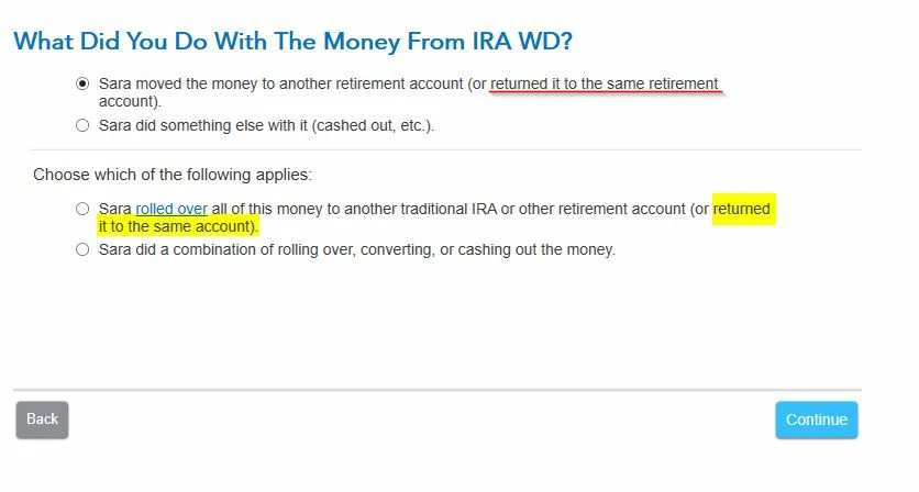 After you enter the 1099R it will ask what you did with it. Pick you moved the money to another account even if you put it back into the same account. Then that will expand and you pick I rolled over all this money. Then it will expand to enter how much you rolled over.