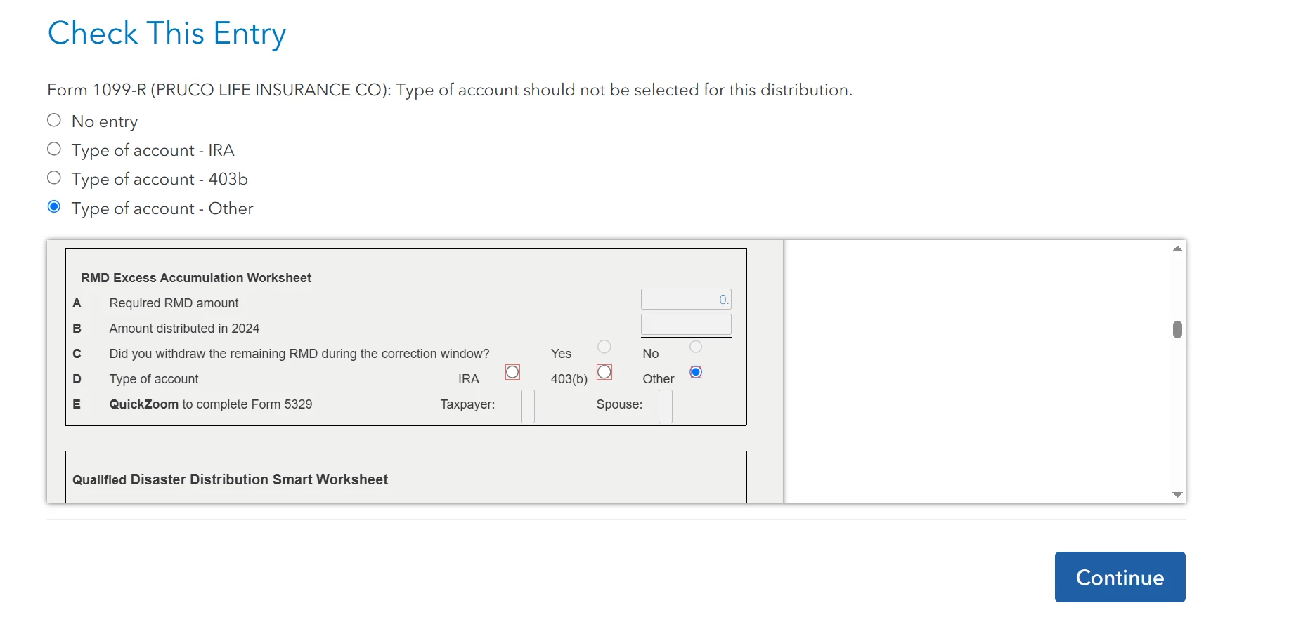 I am having a fix error message when I enter my 1099r unqualified annuity. A rmd worksheet appears and I do not have to take one from this account. I have talked to 5 people at TurboTax. There apparently is a glitch. It appears there have been complaints about it for 2 months now.
