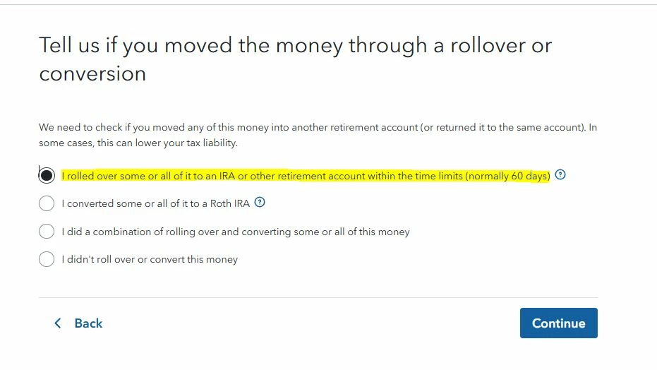 I rolled over my traditional IRA from a Financial institution to a Bank. The financial institution issued a 1099 R and identified it as a distribution (marked 7 in the box). The check was correctly sent directly to the Bank FBO to me. The Bank opened an IRA account and deposited the money within 60 days. How do I identify this transaction correctly within Turbo Tax so the IRS doesn't think it was a distribution. The financial institution will not revise the 1099R. Thanks for your help. Susan