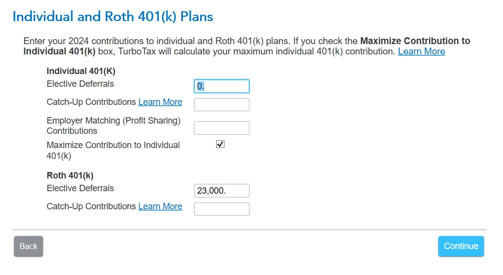 I have a return where the self-employed income is $7,000. I want to confirm what is the maximum amount I can put into a Roth Individual 401k? I'm unsure how to enter the data for a Roth Individual 401k in TT, because there is a section for Individual 401k and a section for Roth 401k. Which section should a Roth Individual 401k go under?