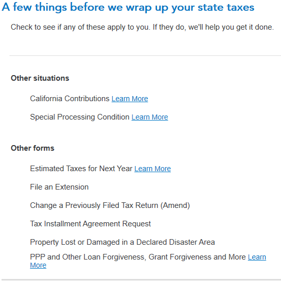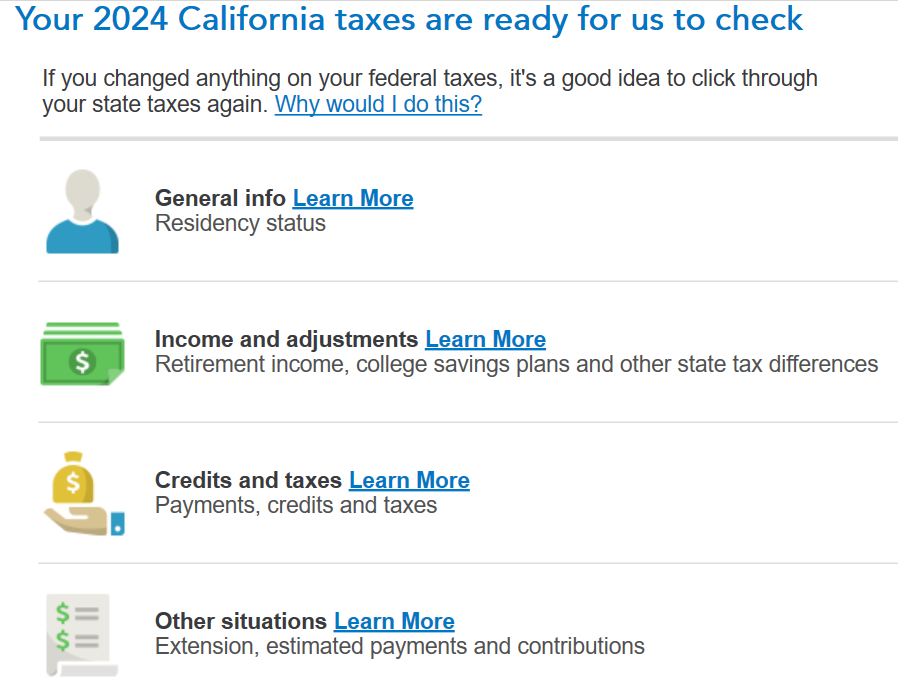 Can you clarify - what are you trying to enter or do? Here is the breakdown of the CA sections in TurboTax. Let us know if you are asking about something else. There are 4 sections; a detail of the last section, Other Situations is below.