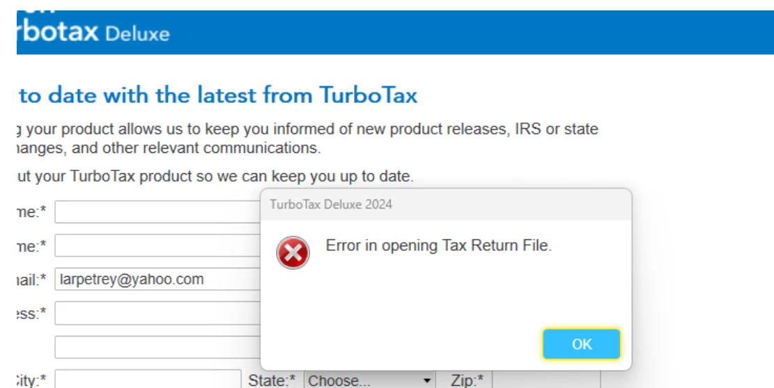 LlarpetreyForum|Forum|1 year agoFebruary 18, 2025Questionerror opening tax file on 2024 taxesForum|Forum|1 year agoFebruary 18, 20251 reply0 viewsNo text available