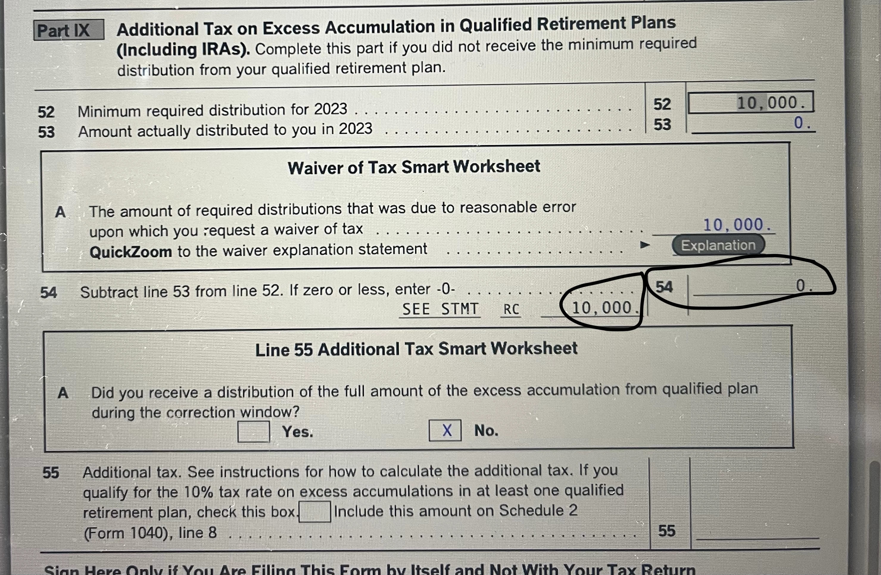 - Line 55: additional Tax Smart Worksheet--answered "NO" but not sure on this response as I looked at the instructions and still confused about the "Corrective window". The full distribution for 2023 was taken on Feb 28, 2024 and federal and state inc taxes were withheld at that time too.