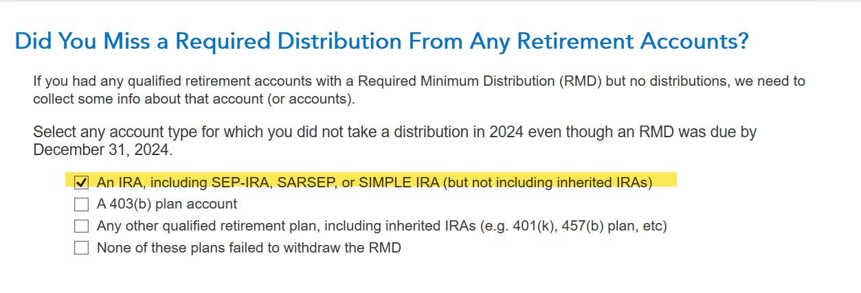 I did not receive the minimum RMD in 2023. How do I fill out form 5329 on TurboTax?