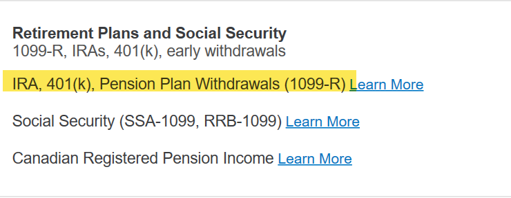 The IRA distribution would be reported on a Form 1099-R entry. You will find that in the Retirement Plans and Social Security section, which is under Wages and Income. Choose IRA, 401(k), Pension Plan Withdrawals (1099-R):